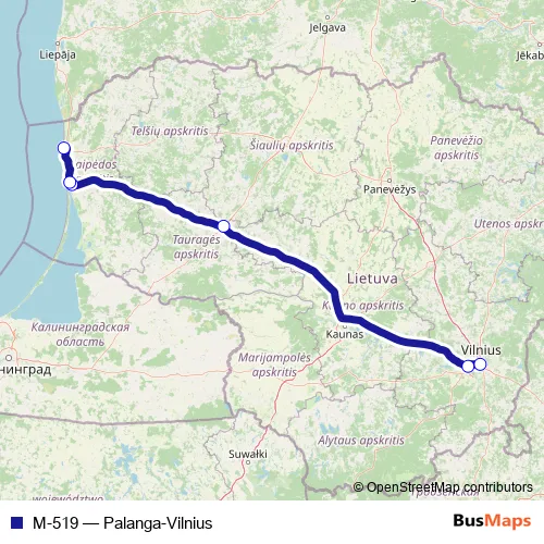 The first stop of the M-519 bus route is Vilniaus autobusų stotis and the last stop is Palangos autobusų stotis. M-519 (Palanga-Vilnius) is operational during everyday.