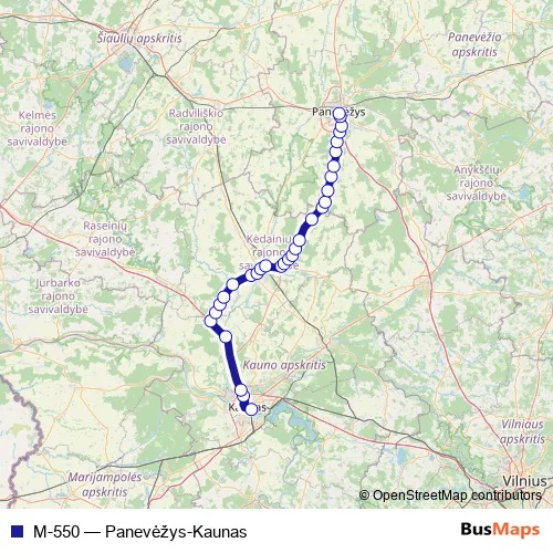 The first stop of the M-550 bus route is Kauno autobusų stotis and the last stop is Panevėžio autobusų stotis. M-550 (Panevėžys-Kaunas) is operational during everyday.