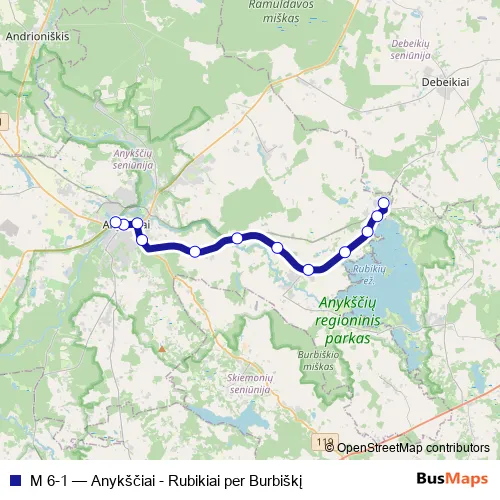 The first stop of the M 6-1 bus route is Rubikiai and the last stop is Anykščių autobusų stotis. M 6-1 (Anykščiai - Rubikiai per Burbiškį) is operational during on weekdays.