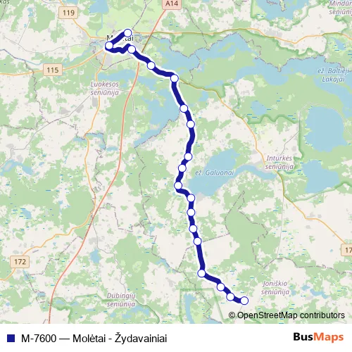 The first stop of the M-7600 bus route is Žydavainiai and the last stop is Molėtų autobusų stotis. M-7600 (Molėtai - Žydavainiai) is operational during on weekdays.