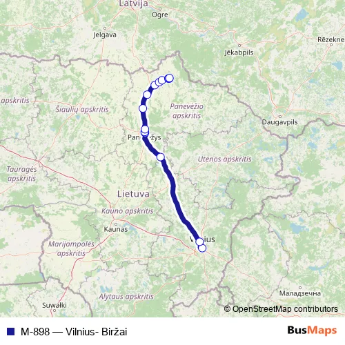 The first stop of the M-898 bus route is Vilniaus autobusų stotis and the last stop is Biržų autobusų stotis. M-898 (Vilnius- Biržai) is operational during everyday.