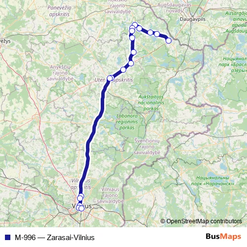 The first stop of the M-996 bus route is Zarasų autobusų stotis and the last stop is Vilniaus autobusų stotis. M-996 (Zarasai-Vilnius) is operational during everyday.