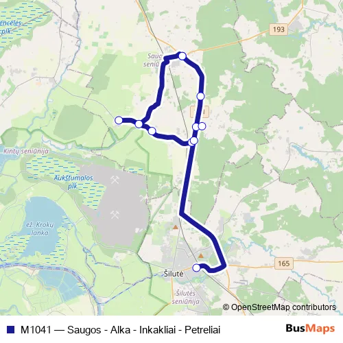 The first stop of the M1041 bus route is Saugos and the last stop is Šilutės AS; 1 aikštelė. M1041 (Saugos - Alka - Inkakliai - Petreliai) is operational during everyday.
