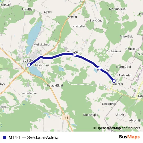 The first stop of the M14-1 bus route is Auleliai and the last stop is Svėdasai. M14-1 (Svėdasai-Auleliai) is operational during on weekdays.