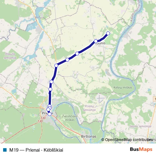 The first stop of the M19 bus route is Kėbliškiai and the last stop is Prienų autobusų stotis. M19 (Prienai - Kėbliškiai) is operational during everyday.