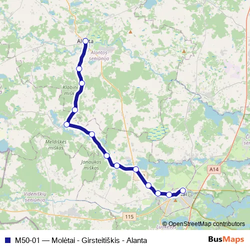 The first stop of the M50-01 bus route is Molėtų autobusų stotis and the last stop is Alanta. M50-01 (Molėtai - Girsteitiškis - Alanta) is operational during on weekdays.