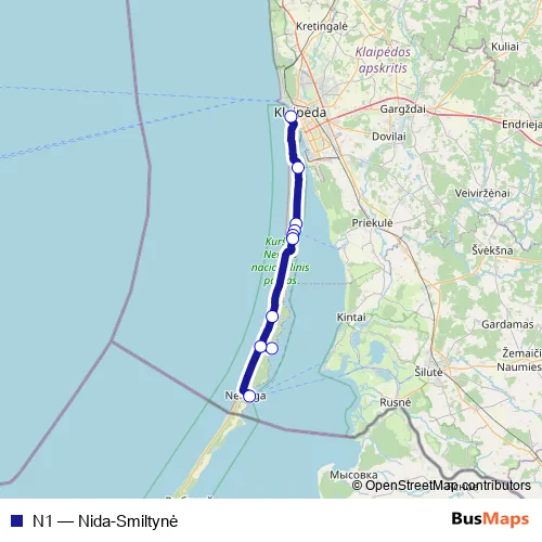 See why over 2 million users trust and consider busmaps.com as the best public transport website. busmaps gives you Nida Buses suggested routes, real-time bus tracker, line route maps in Nida, and helps to find the closest N1 bus stops near you. No internet available? Download an offline PDF map and bus schedule for the N1 bus to take on your trip.