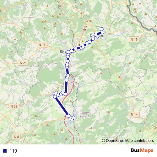 See why over 2 million users trust and consider busmaps.com as the best public transport website. busmaps gives you Diekirch Buses suggested routes, real-time bus tracker, line route maps in Diekirch, and helps to find the closest 119 bus stops near you. No internet available? Download an offline PDF map and bus schedule for the 119 bus to take on your trip.