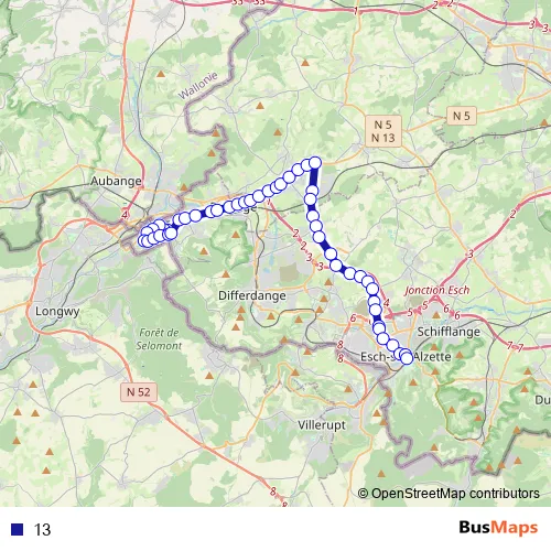 The first stop of the 13 bus route is Rodange, Rue Joseph Moscardo and the last stop is Esch-sur-Alzette, Gare routière. 13 is operational during everyday.
