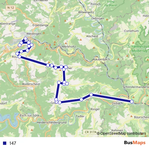 The first stop of the 147 bus route is Goebelsmühle, Op der Gare and the last stop is Wiltz, Lycée du Nord. 147 is operational during everyday.