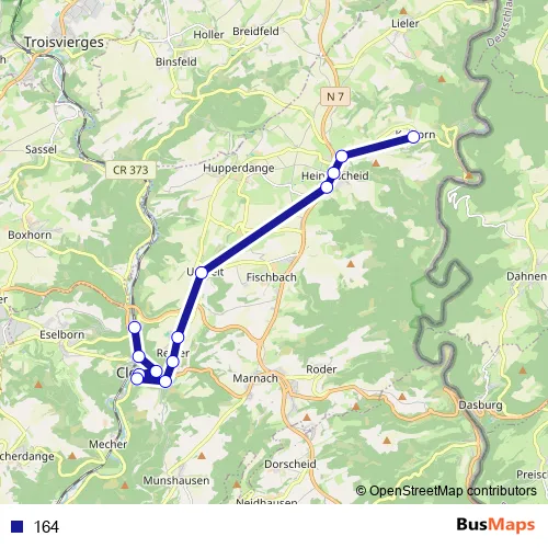 The first stop of the 164 bus route is Clervaux, Gare routière/Lycée and the last stop is Clervaux, Kalborn/Kaalber. 164 is operational during everyday.