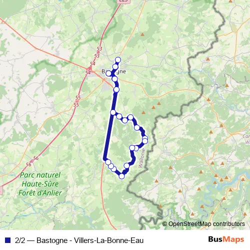 The first stop of the 2/2 bus route is Bastogne Pépinière - Quai 1 and the last stop is Sainlez Eglise. 2/2 (Bastogne - Villers-La-Bonne-Eau) is operational during on weekdays.