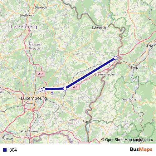 See why over 2 million users trust and consider busmaps.com as the best public transport website. busmaps gives you Luxembourg Buses suggested routes, real-time bus tracker, line route maps in Luxembourg, and helps to find the closest 304 bus stops near you. No internet available? Download an offline PDF map and bus schedule for the 304 bus to take on your trip.