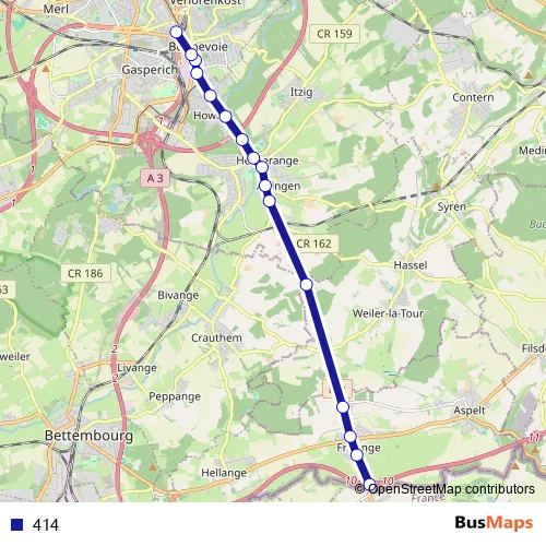See why over 2 million users trust and consider busmaps.com as the best public transport website. busmaps gives you Luxembourg Buses suggested routes, real-time bus tracker, line route maps in Luxembourg, and helps to find the closest 414 bus stops near you. No internet available? Download an offline PDF map and bus schedule for the 414 bus to take on your trip.