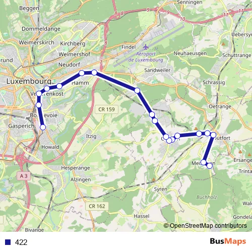 See why over 2 million users trust and consider busmaps.com as the best public transport website. busmaps gives you Luxembourg Buses suggested routes, real-time bus tracker, line route maps in Luxembourg, and helps to find the closest 422 bus stops near you. No internet available? Download an offline PDF map and bus schedule for the 422 bus to take on your trip.