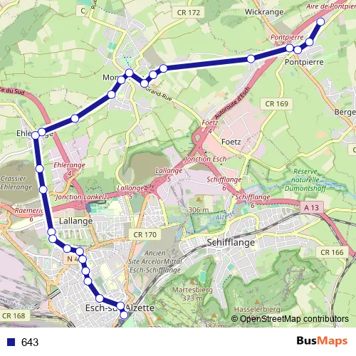 The first stop of the 643 bus route is Pontpierre, Europastrooss and the last stop is Esch-sur-Alzette, Gare routière. 643 is operational during everyday.