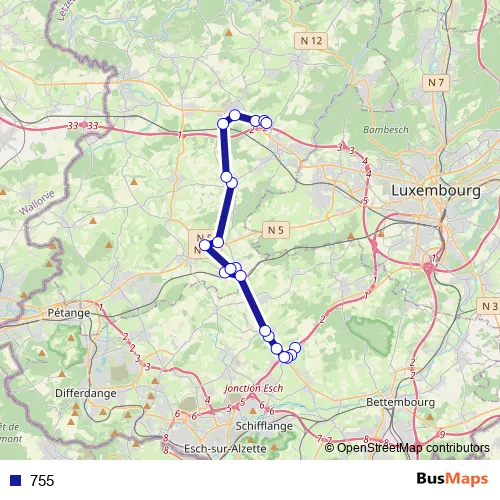The first stop of the 755 bus route is Pontpierre, Europastrooss and the last stop is Capellen, Pafebruch. 755 is operational during everyday.