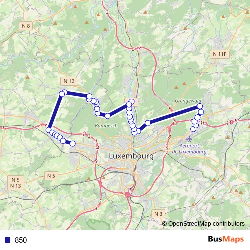 The first stop of the 850 bus route is Aéroport Luxembourg/Findel and the last stop is Bertrange, Belle-Etoile. 850 is operational during everyday.