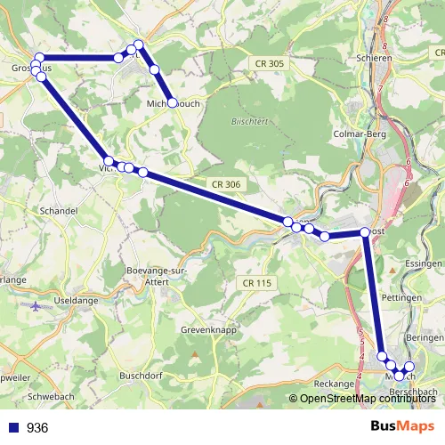 The first stop of the 936 bus route is Michelbouch and the last stop is Mersch, Gare routière. 936 is operational during everyday.