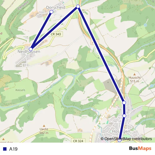 The first stop of the A19 bus route is Hosingen, Eesberwee and the last stop is Dorscheid, Am Duerf. A19 is operational during on weekdays.