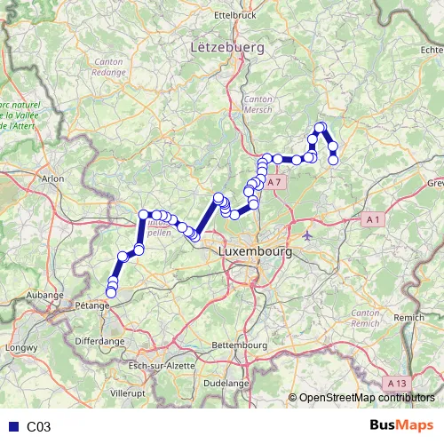 The first stop of the C03 bus route is Junglinster, Lënster Lycée and the last stop is Bascharage, Eglise. C03 is operational during on weekdays.