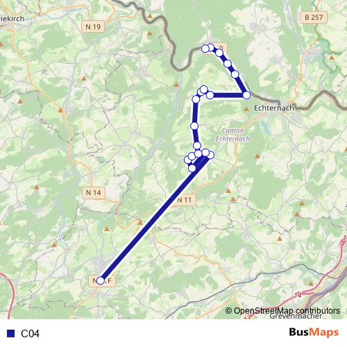 The first stop of the C04 bus route is Junglinster, Lënster Lycée and the last stop is Bollendorf-Pont, Gare. C04 is operational during on weekdays.