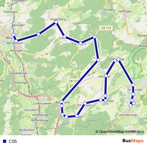 The first stop of the C05 bus route is Junglinster, Lënster Lycée and the last stop is Mersch, Gare routière. C05 is operational during on weekdays.