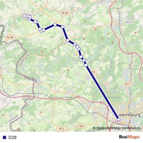 The first stop of the D29 bus route is Merl, Geesseknäppchen (N) and the last stop is Redange/Attert, Gare. D29 is operational during on weekdays.