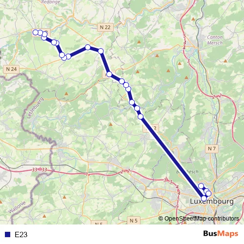 The first stop of the E23 bus route is Limpertsberg, L.T.C. and the last stop is Redange/Attert, Gare. E23 is operational during on weekdays.