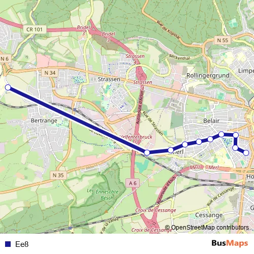 The first stop of the Ee8 bus route is Bertrange, Ecole Européenne Ii and the last stop is Hollerich, Nancy. Ee8 is operational during on weekdays.
