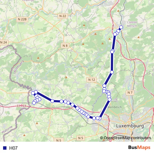 The first stop of the H07 bus route is Mersch, Gare routière and the last stop is Kleinbettingen, Gare routière. H07 is operational during on weekdays.