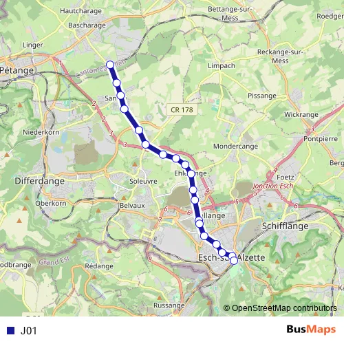 The first stop of the J01 bus route is Bascharage/Sanem, Gare routière and the last stop is Esch-sur-Alzette, Gare routière. J01 is operational during on weekdays.