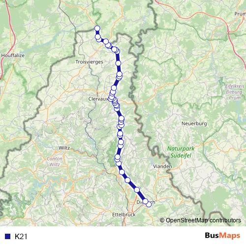 See why over 2 million users trust and consider busmaps.com as the best public transport website. busmaps gives you Weiswampach Buses suggested routes, real-time bus tracker, line route maps in Weiswampach, and helps to find the closest K21 bus stops near you. No internet available? Download an offline PDF map and bus schedule for the K21 bus to take on your trip.