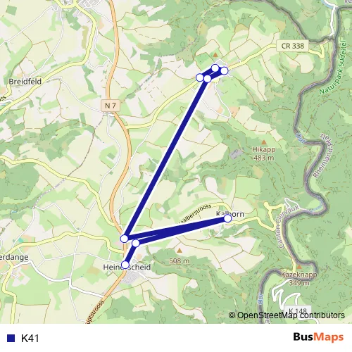The first stop of the K41 bus route is Heinerscheid, Geméin and the last stop is Lieler, Om Knupp. K41 is operational during on weekdays.
