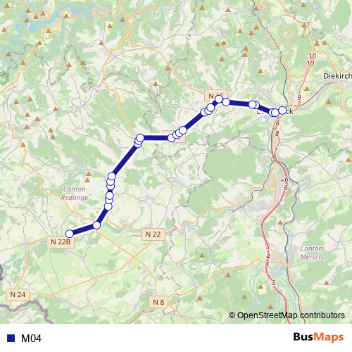 The first stop of the M04 bus route is Redange/Attert, Lycée Atert and the last stop is Ettelbruck, Gare routière. M04 is operational during on weekdays.
