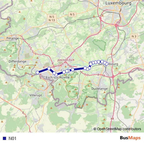 The first stop of the N01 bus route is Bettembourg, Gare routière and the last stop is Belvaux, Lycée Bel-Val. N01 is operational during on weekdays.