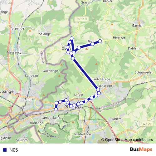 The first stop of the N05 bus route is Fingig, Maerchen and the last stop is Lamadelaine, LMA Centre de Lamadelaine. N05 is operational during on weekdays.