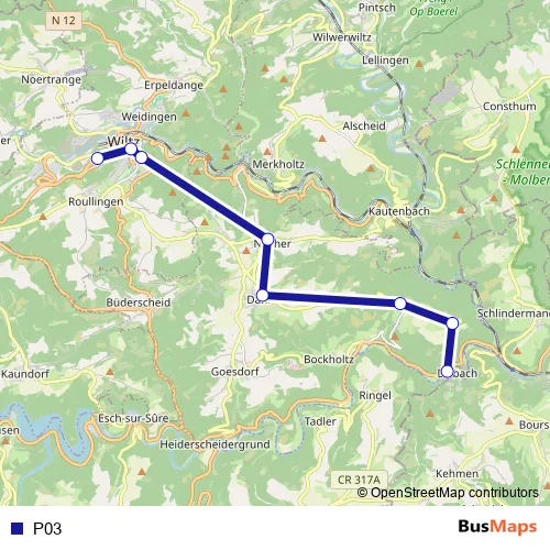 The first stop of the P03 bus route is Wiltz, Lycée du Nord and the last stop is Dirbach, Village. P03 is operational during on weekdays.
