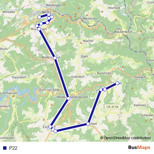 See why over 2 million users trust and consider busmaps.com as the best public transport website. busmaps gives you Wiltz Buses suggested routes, real-time bus tracker, line route maps in Wiltz, and helps to find the closest P22 bus stops near you. No internet available? Download an offline PDF map and bus schedule for the P22 bus to take on your trip.