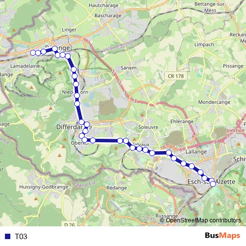 The first stop of the T03 bus route is Lamadelaine, LMA Centre de Lamadelaine and the last stop is Esch-sur-Alzette, Gare routière. T03 is operational during on weekdays.