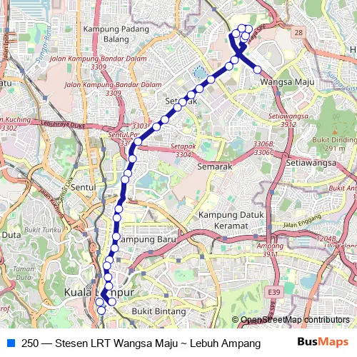 The first stop of the 250 bus route is Kl192 LRT Wangsa Maju and the last stop is Kl117 BSN Lebuh Ampang. 250 (Stesen LRT Wangsa Maju ~ Lebuh Ampang) is operational during everyday.