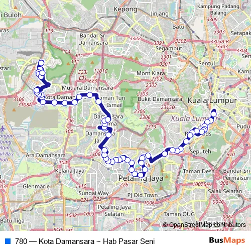 The first stop of the 780 bus route is (M) Kl2212 Pasar Seni (Platform D1 - D6) and the last stop is Pj63 PPR Kota Damansara. 780 (Kota Damansara ~ Hab Pasar Seni) is operational during everyday.
