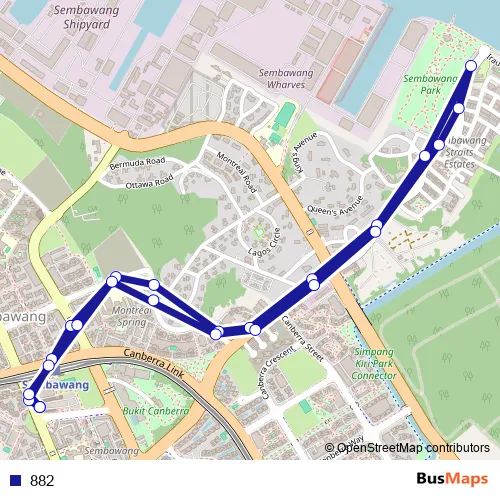 The first stop of the 882 bus route is Sembawang Int and the last stop is Sembawang Int. 882 is operational during everyday.