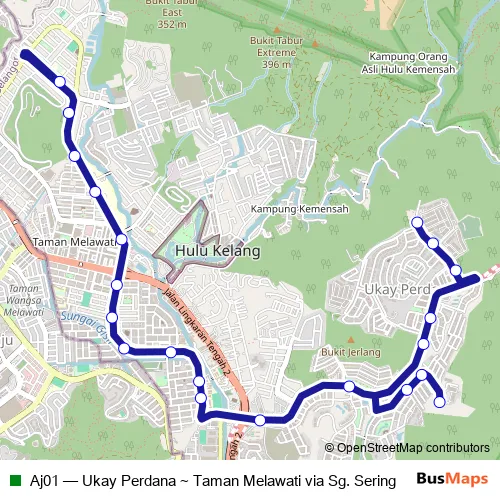 The first stop of the Aj01 bus route is Hentian Ukay Perdana and the last stop is Aj356 SK Taman Melawati. Aj01 (Ukay Perdana ~ Taman Melawati via Sg. Sering) is operational during everyday.