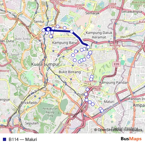 The first stop of the B114 bus route is Hab Bas Titiwangsa, Jalan Tun Razak and the last stop is Hab Bas Maluri, Jalan Cheras. B114 (Maluri) is operational during everyday.