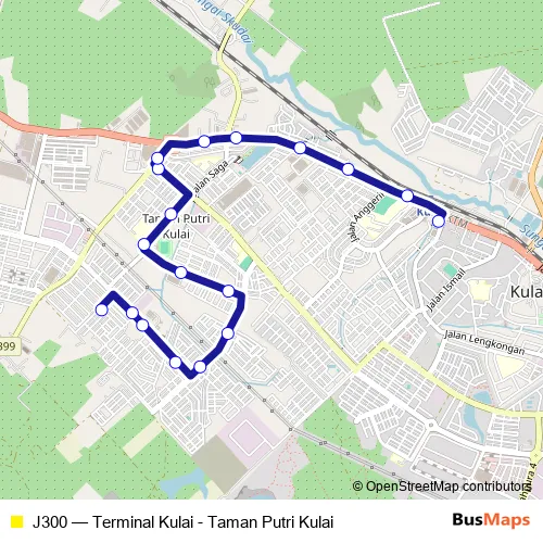 The first stop of the J300 bus route is Terminal Putri Kulai and the last stop is Terminal Kulai. J300 (Terminal Kulai - Taman Putri Kulai) is operational during everyday.