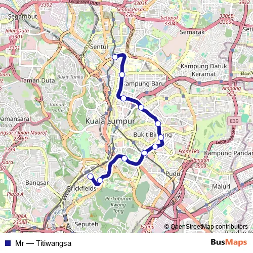 The first stop of the Mr rail route is KL Sentral Monorail and the last stop is Titiwangsa Monorail. Mr (Titiwangsa) is operational during everyday.