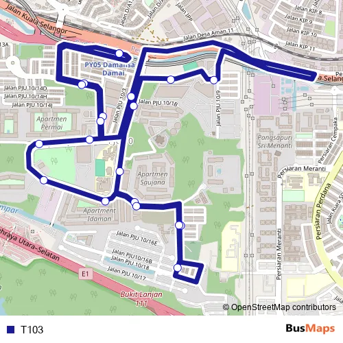 The first stop of the T103 bus route is MRT Damansara Damai Pintu B and the last stop is MRT Damansara Damai Pintu B. T103 is operational during everyday.