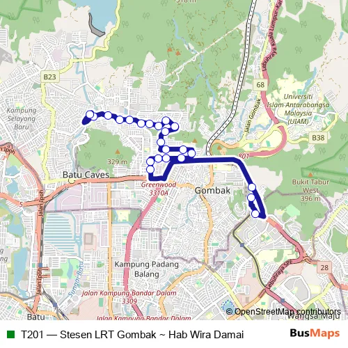 The first stop of the T201 bus route is Sl311 LRT Gombak and the last stop is Sl294 HAB Wira Damai. T201 (Stesen LRT Gombak ~ Hab Wira Damai) is operational during everyday.