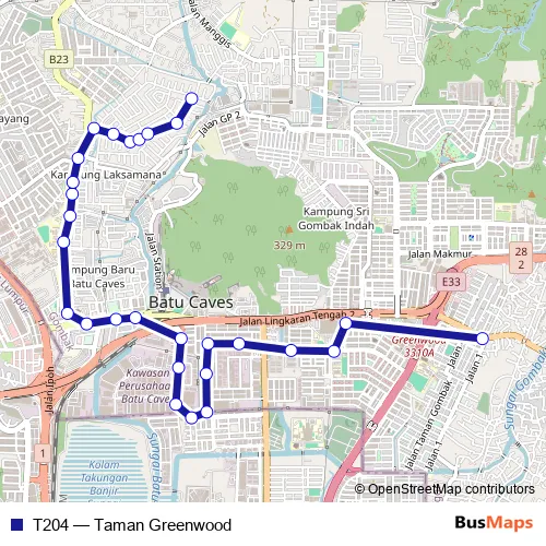 The first stop of the T204 bus route is Taman Greenwood, Jalan Batu Caves and the last stop is Kampung Nakhoda, Jalan Nakhoda Kanan. T204 (Taman Greenwood) is operational during everyday.
